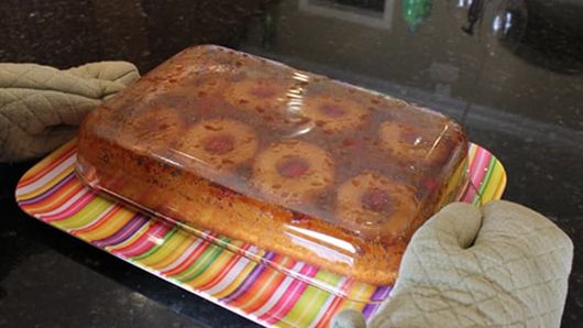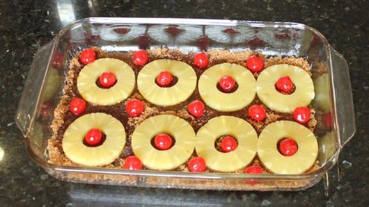 Add enough water to reserved pineapple juice to measure 1 cup. Make cake batter as directed on box, substituting pineapple juice mixture for the water. Pour batter over pineapple and cherries.