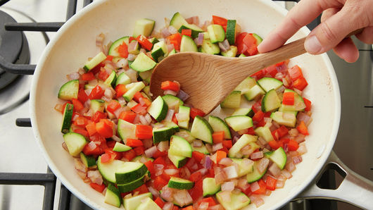 In same skillet, heat remaining 2 teaspoons oil over medium heat. Add onions, zucchini and bell pepper; cook 4 to 6 minutes, stirring occasionally, until vegetables are crisp-tender.